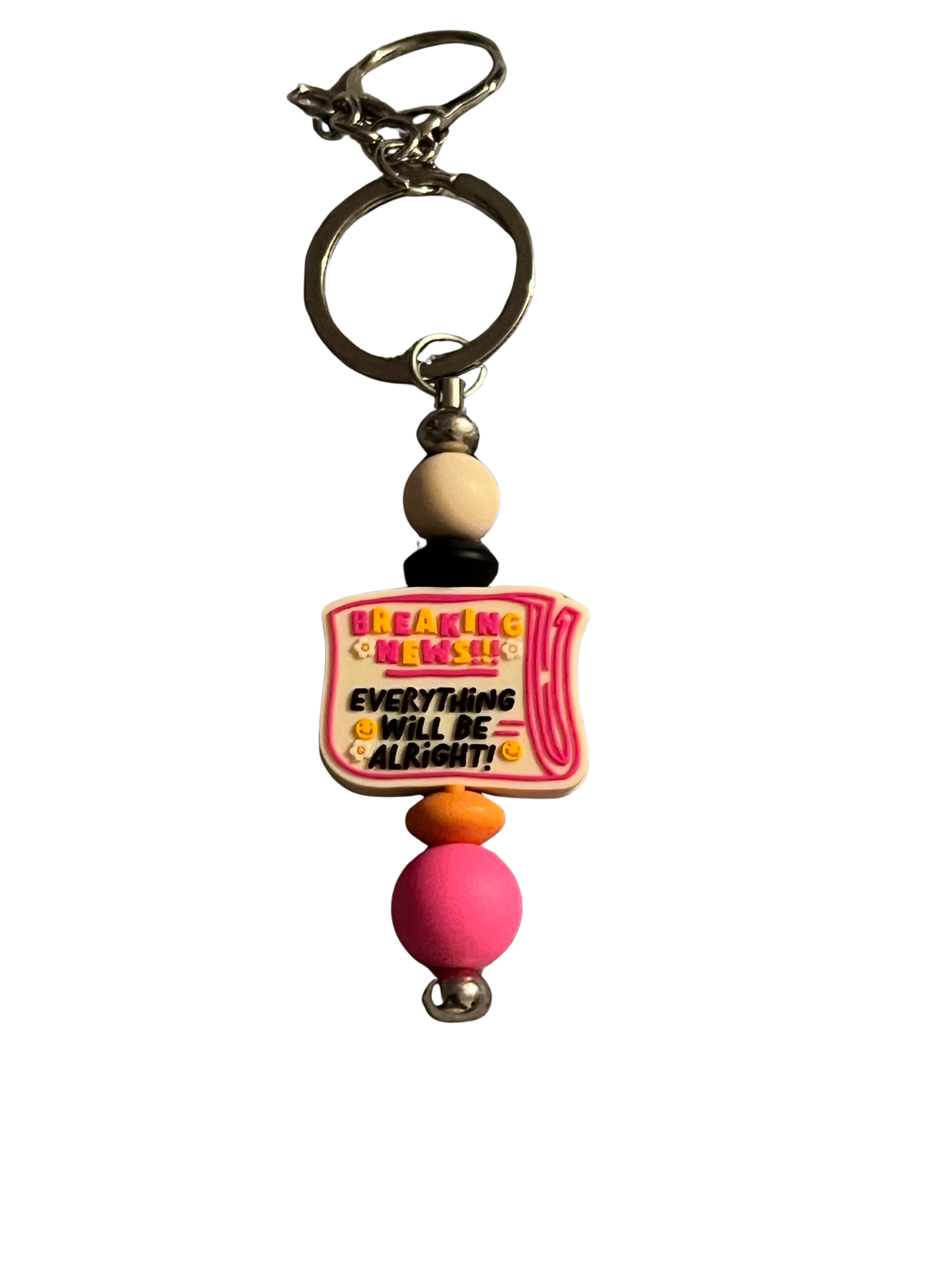 Add a burst of positivity to your day with this vibrant handmade beaded keychain! Featuring a cheerful “Breaking News” newspaper charm with the uplifting headline “Everything Will Be Alright!!” in bold, happy lettering, this piece is designed to brighten your mood and your keys. Accented with colorful silicone beads—pink, orange, black, and cream—plus metallic details, it’s a perfect little reminder to stay hopeful.