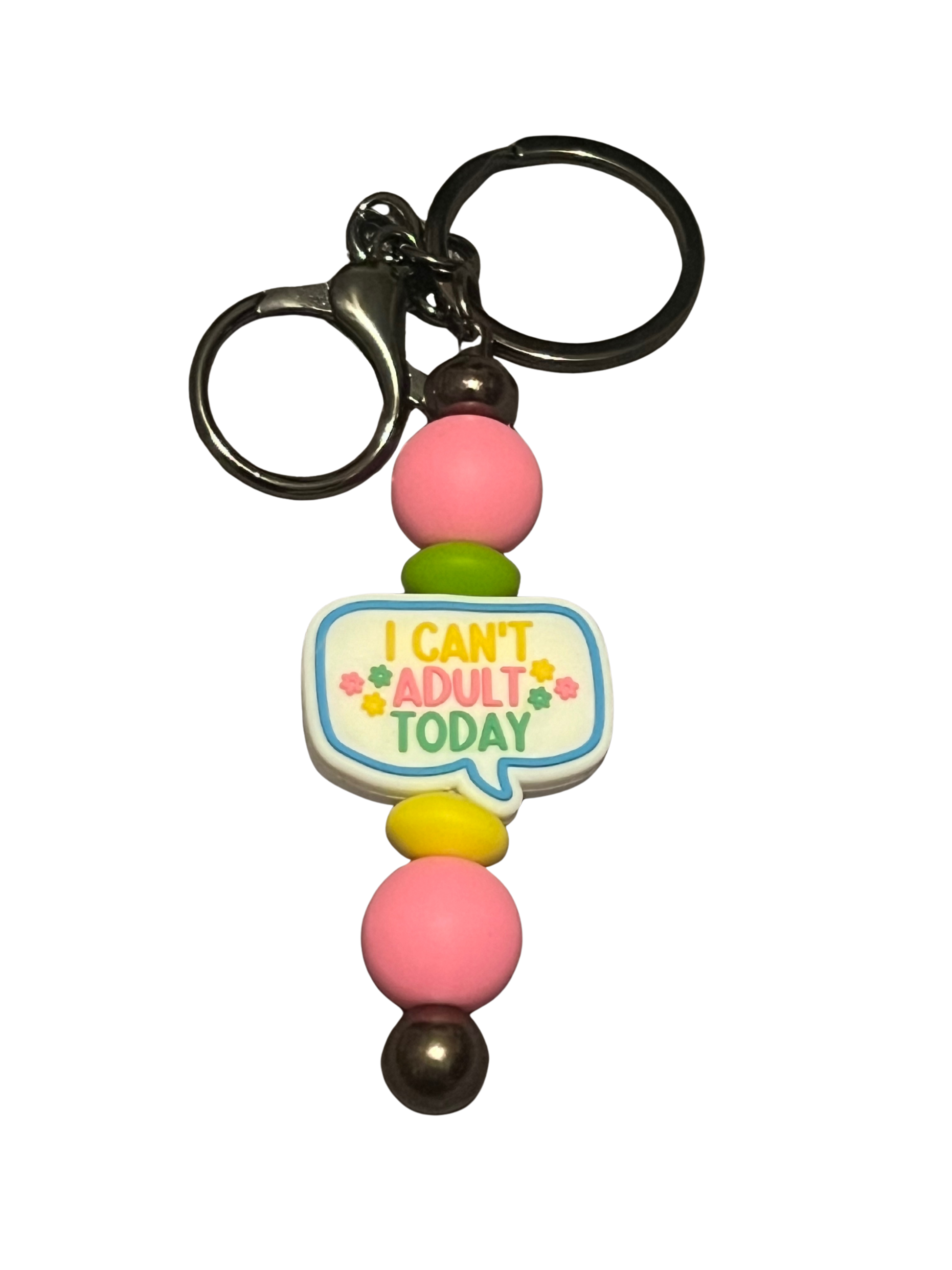 This playful handmade keychain features a fun and relatable message: “I CAN’T ADULT TODAY” displayed in colorful block letters inside a speech bubble charm. The charm is accented with little flowers, adding a cute, cheerful vibe.