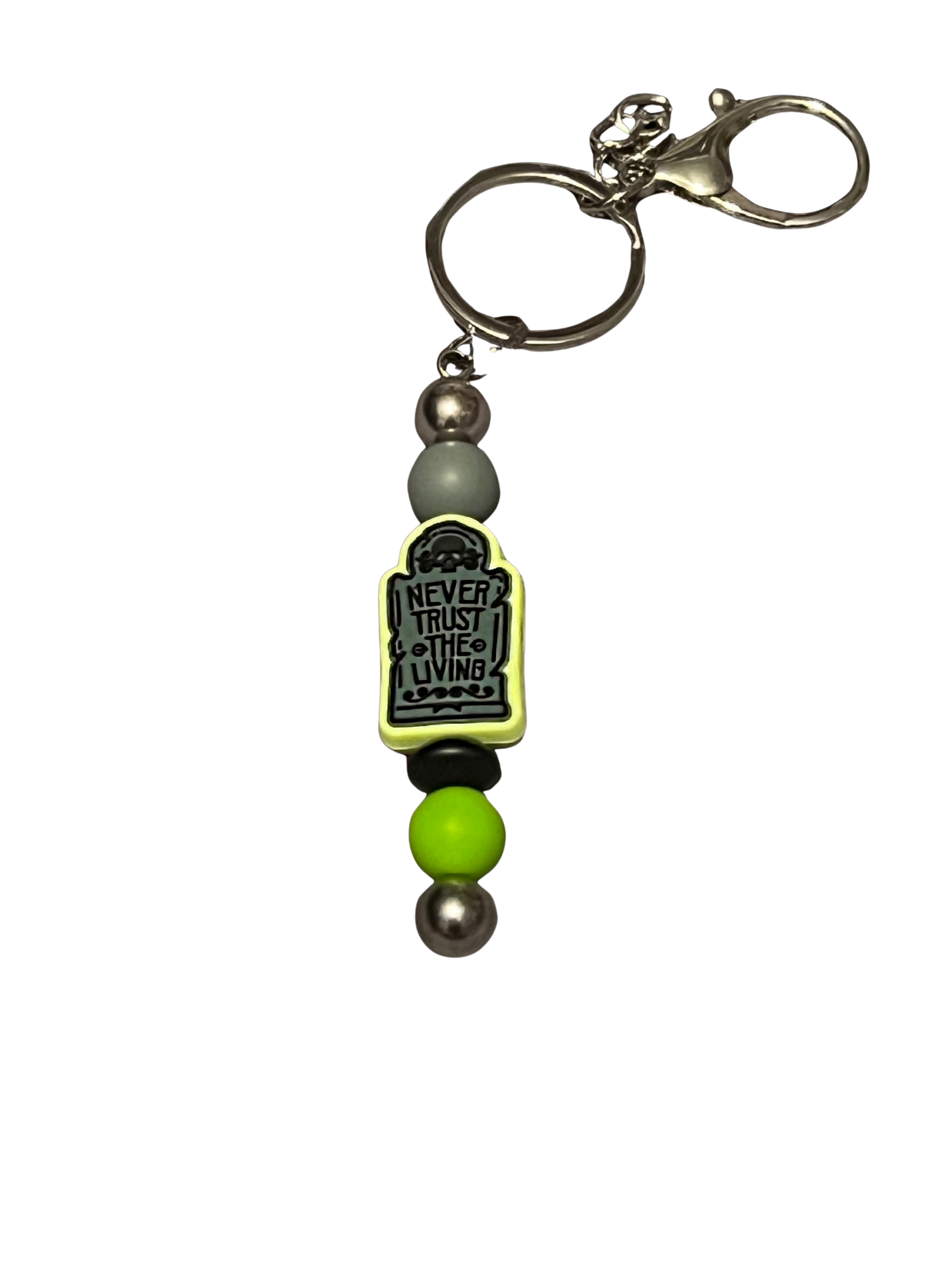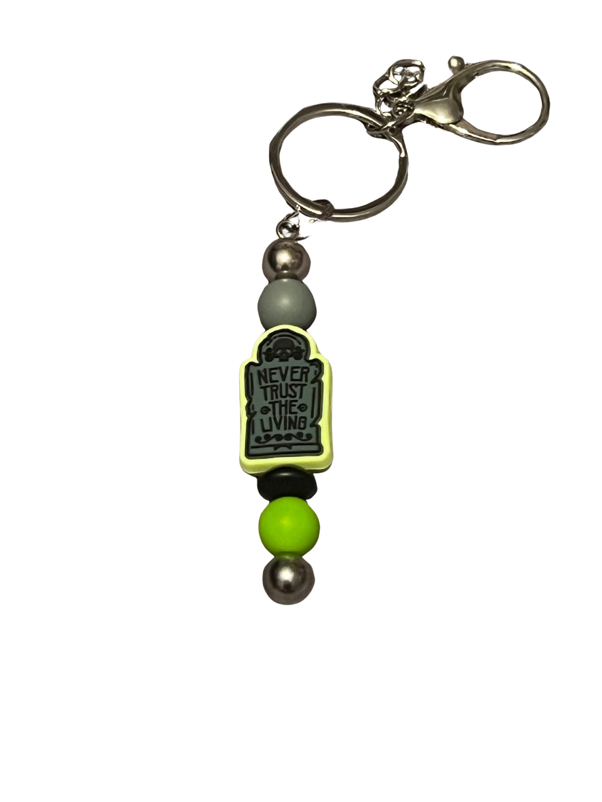 Spooky season vibes all year round! This handmade beaded keychain features a glowing neon green and gray bead combo with a tombstone charm that boldly warns: