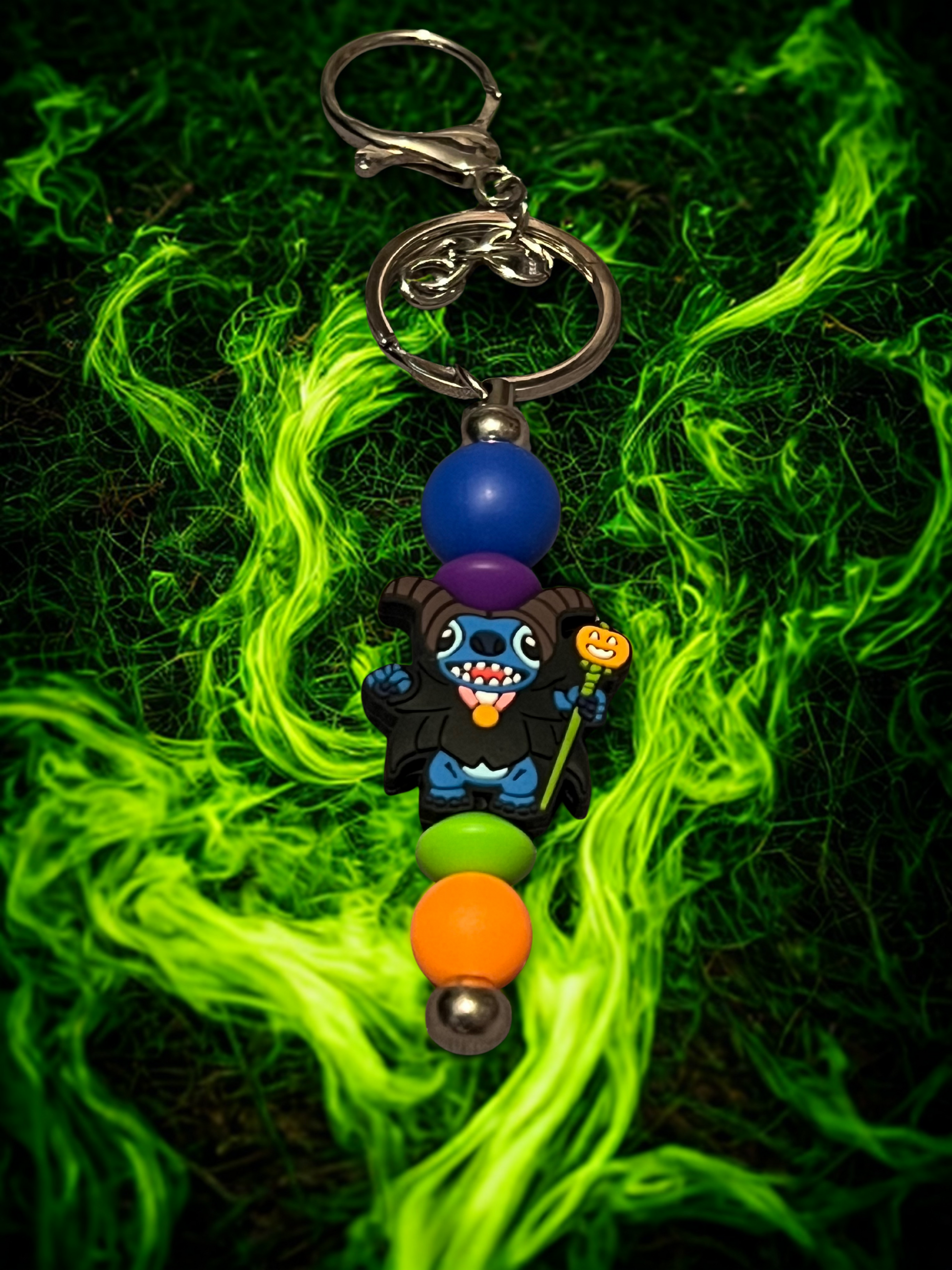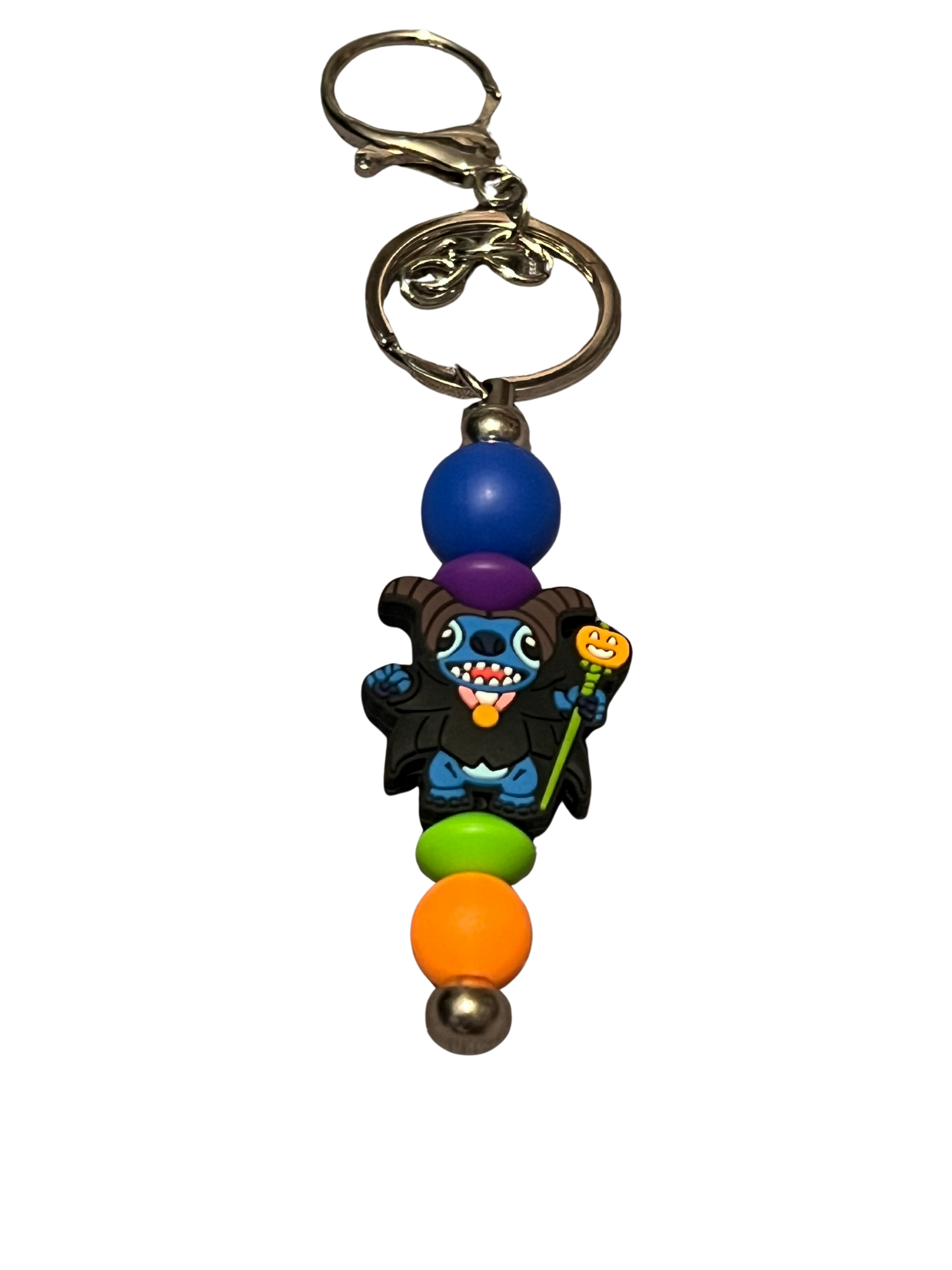 This mischievous mashup is pure magic! Featuring Stitch dressed as Maleficent—complete with horns, a staff, and an extra dose of attitude—this handmade beaded keychain is a colorful collision of cute and villainous. Bright Halloween-inspired beads add extra pop to this playful, one-of-a-kind accessory.