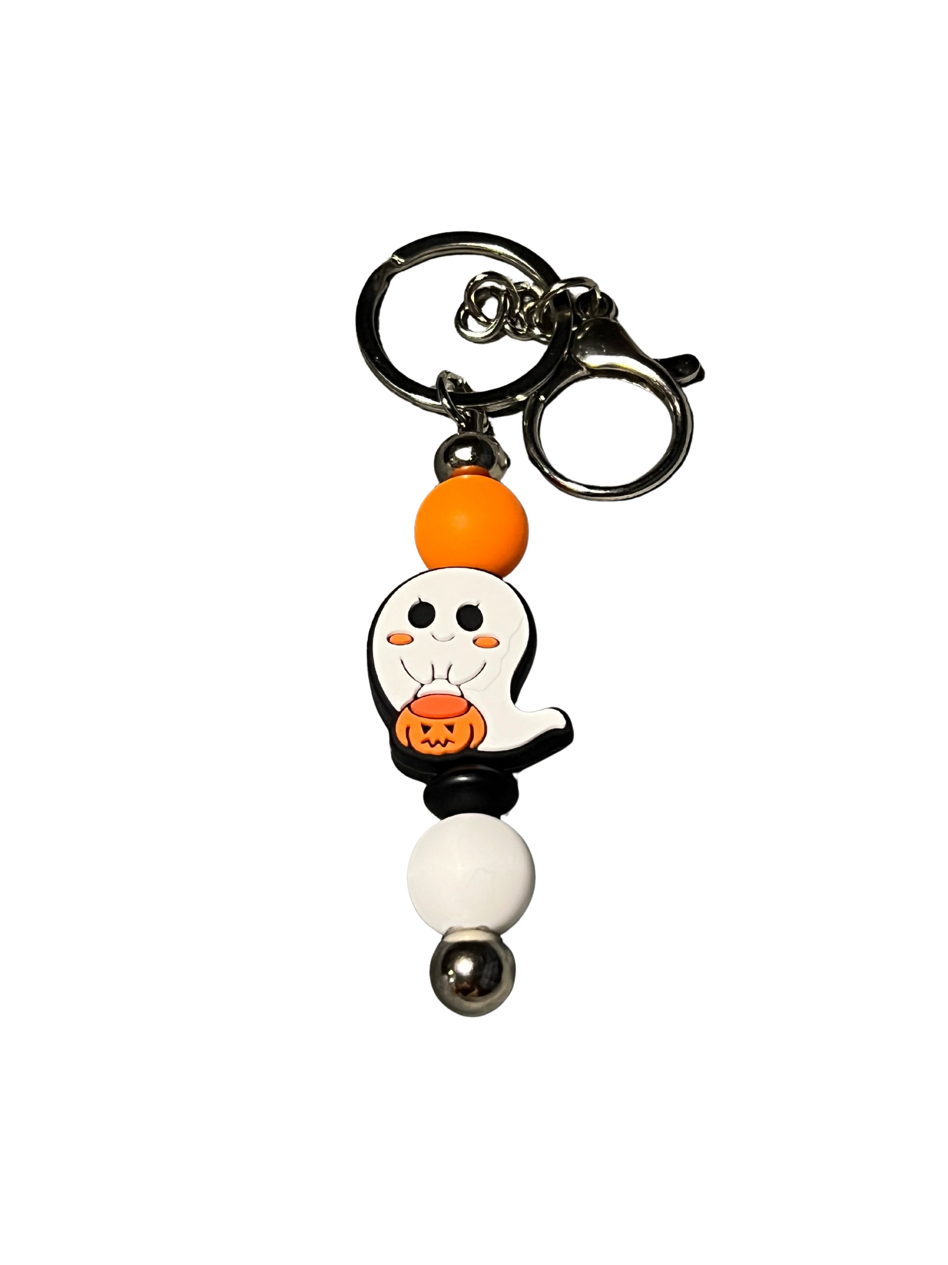 Add a touch of spooky sweetness to your everyday style with this handmade Halloween keychain! Featuring an adorable ghost holding a smiling jack-o’-lantern bucket, accented with festive orange, crisp white, and sleek black beads. Finished with a shiny silver bell for a playful jingle. Perfect for keys, bags, or as a charming seasonal gift for anyone who loves cute Halloween vibes. 🎃✨