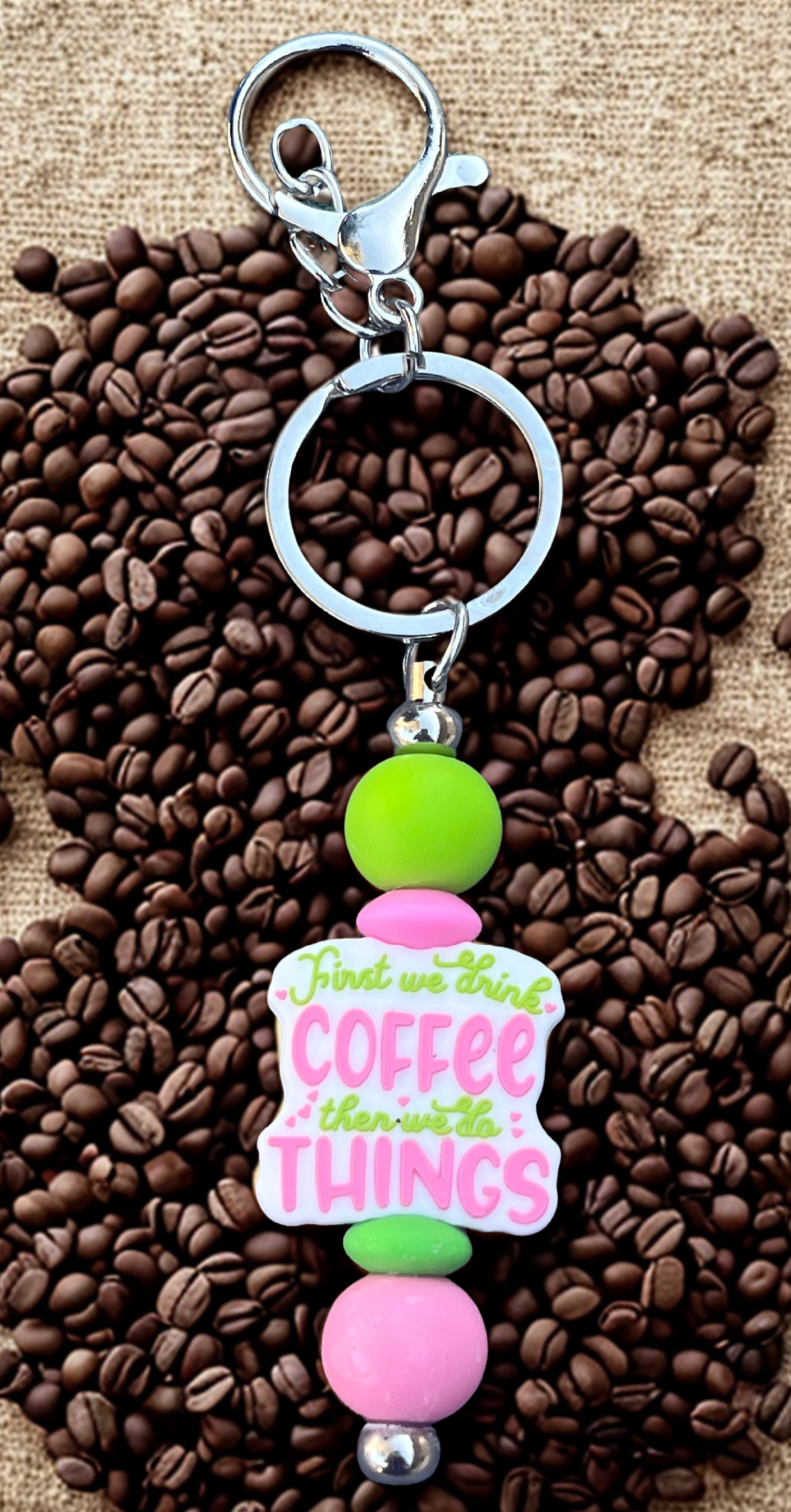 Handmade “First We Drink Coffee, Then We Do Things” Beaded Keychain